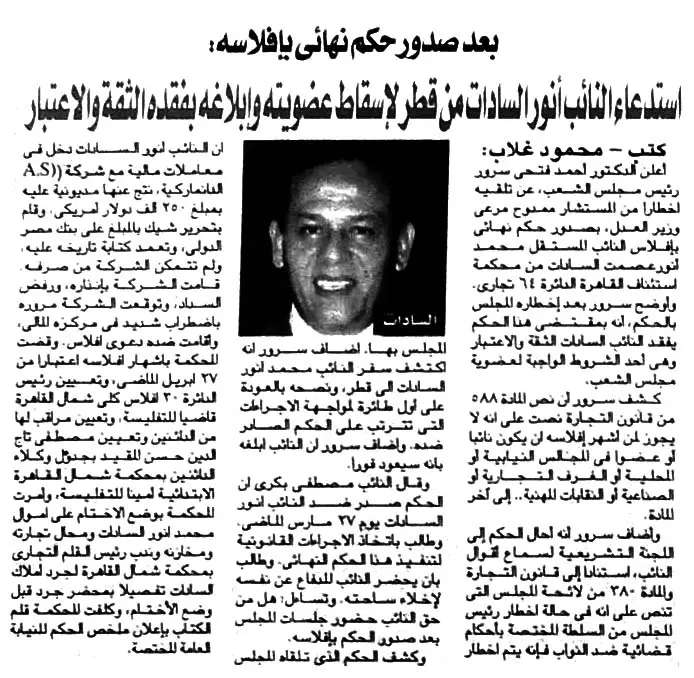 بعد صدور حكم نهائى بإفلاسه : استدعاء النائب أنور السادات من قطر لإسقاط عضويته وإبلاغه بفقده الثقة والاعتبار
