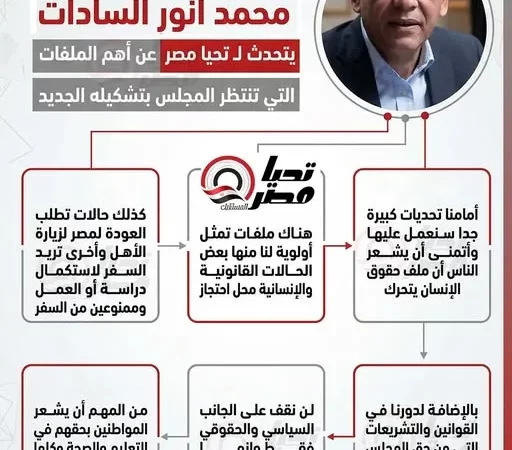 وقال السادات، في تصريحات خاصة لـ”تحيا مصر”، إن هناك تحديات كبيرة تنتظر المجلس بتشكيله الجديد، مشيرًا إلى أنه سيتم تحديد الأولويات عقب الاجتماع الأول بكامل الأعضاء، ووضع رؤية وسياسة واضحة للتعامل مع الملفات المختلفة.
