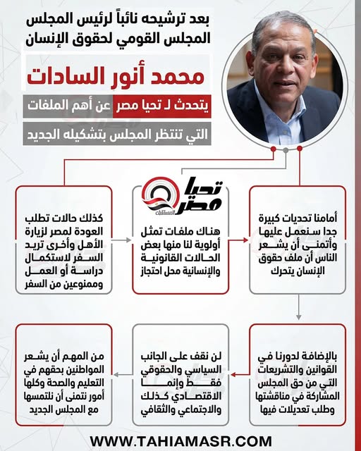 أكد محمد أنور السادات، المرشح لمنصب نائب رئيس المجلس القومي لحقوق الإنسان، أن المجلس ينتظر صدور القرار الجمهوري بتشكيله الجديد، تمهيدًا لبدء العمل رسميًا على الملفات والتحديات المطروحة خلال المرحلة المقبلة.